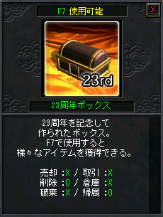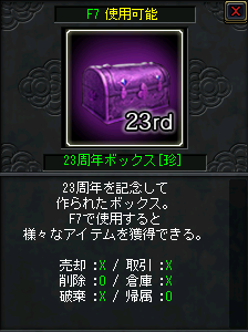 ※「23周年ボックス[珍]」は「23周年ボックス」からも非常に低い確率で出現します。 ※赤文字のアイテムは、すべて取引不可となります。 ![]()