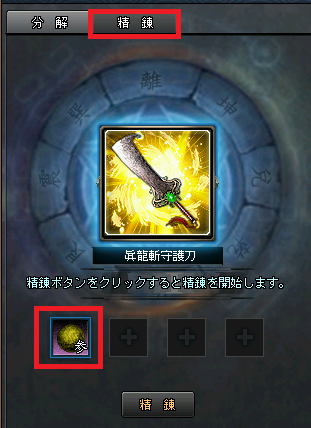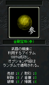 ■概要 2025年10月22日(水)メンテナンス時に 新アイテム「金剛宝珠(参)」を実装いたしました。 ![]() ■アイテムの利用方法について 使用方法については「金剛宝珠」と同様に精錬UIに「武器」とあわせて設定することで利用できます。 「金剛宝珠(参)」を使用して精練を行った場合、オプションの最低値が変更されます。 ![]() 「金剛宝珠」とは、アイテム使用時の成功確率が異なります。 ※精錬1回ごとに、成功/失敗問わず金剛宝珠(参)が1個消費されます。 ※1度に複数個の金剛宝珠(参)を精錬UIでセットしても1回分の精錬しかできません。 ■オプションの最低値について 「金剛宝珠(参)」を使用した場合に限り、設定されるオプションの最低値が変更されます。 【精錬で獲得できるオプション】 ※対象範囲の小数点第一位の単位まで含めた数値が抽選対象となります。 ※気力増加の場合は20,000~30,000までの数値全てが抽選対象です。 ※武技射程距離増加は【遠距離武技】にのみ適用されますが、遠距離武技の最大適用射程は+7であるため、 既に他の装備効果にて射程距離が最大値となっている場合、効果はありません。 ■「金剛宝珠(参)」の獲得手段について イベントキャンペーンにて獲得可能。 ■備考 仕様につきましては、予告無く変更・取り消しが 行われる可能性が御座います。予めご了承下さい。 ■対応状況 2025年10月22日 情報の掲載・導入 |