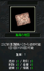 ■関連NPCについて ゴビ砂漠NPC「闇商人」の「瀚海の地図返却」メニューより クエストを受諾することができます。 ■受諾可能回数について 「瀚海の地図返却」のクエストは条件によって上限回数が異なります。 ■報酬内容について ゴビ砂漠NPC「闇商人」に「瀚海の地図返却」でクリアすると 報酬内容を獲得することができます。 ■「瀚海の地図」の獲得方法について 「瀚海の地図」は、「ゴビ砂漠/ゴビ砂漠(西)/ゴビ砂漠(東)」の いずれのモンスターを討伐時に低確率でドロップいたします。 ![]() ■一日クエストを利用する上での注意事項 NPC【闇商人】に対し、「クエスト受諾」「クエスト報告」を行う場合でも 他のプレイヤーは攻撃を行うことができますのでご注意ください。 ■備考 仕様につきましては、予告無く変更・取り消しが 行われる可能性が御座います。予めご了承下さい。 ■対応状況 2026年1月28日 情報の掲載・導入 |