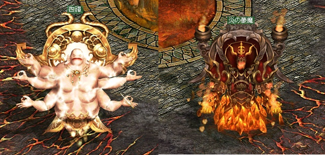 ■フィールドボスについて ゴビ砂漠(西/東)に出現する専用NPCより「鍵アイテム」を使用し、ボスが出現するフィールドに入場します。 ※キャラクター選択画面/接続の切断/キャラクター死亡時には洛陽城へ移動します。 ※ボスが出現する部屋でもPvPは可能で、ゴビ砂漠ポイントは増減します。 ■報酬内容について フィールドボス「四禪/炎の夢魔」を討伐すると【確率で】報酬内容を獲得することができます。 ![]() ■ボス討伐の流れ 1次~5次まで順番に討伐が必要となります。 ※ボス討伐時/再出現時にはログメッセージが表示されます。